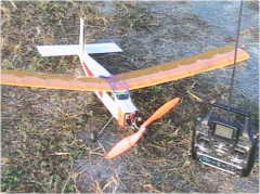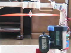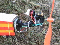私のモータテスト機のラトルスネイクターボポーター君です。 ギヤダウンモータは、即席で固定しました。 使っているのは使い捨てカミソリの柄です。 離陸させたくて、モータを上の方に取り付けたのでぶさいくになりました。 さて、飛行は1200mA3セル(300g)と340mA3セル(270g)です。 飛行は軽快で音も静か、モータ発熱はほんのり熱くなるだけでした。 最初に300gでは、2メートルで離陸、80度ぐらいでぐいぐい上昇します。 フルハイではホバリングしながらゆっくり垂直上昇しました。 次に270gは、1メートルで離陸、軽い軽い垂直上昇でいっきに50mほど あがりました。 5フライトしまして、写真を撮ってテスト終了。 機体重量を270g以内にすれば、ファンフライ機に使用可能でしょう。 GWS1047プロペラでほとんど発熱しないので、 11インチ・12インチペラも使えるかも。 ギヤダウン化は大成功でした! さらに推力400gオーバーをめざしてモータを作ってみます。 |