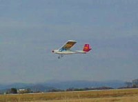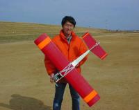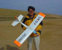 空撮用の「やぐら」が主翼上に取付けられています。 風が強かったため、し性が安定しませんでしたが、 この後見事に成功しました。 でも・・・・無理は禁物!? |