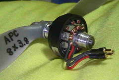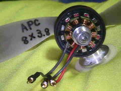 <その1> 組み立てたギヤダウンは、一発で回りました、出だし好調で〜す。 テスト仕様 モータ:巻線0.35mm20ターン・スター結線・ネオジウム磁石 ギヤダウン:ギヤ比3.5(ピニオン16T、メイン56T) ペラ:GWS9047/GWS1047/GWS1080の3種類 電池:リポ1200mA3セル アンプ:フェニックス10(新ソフト) 計測値: EP1080ペラ 推力315g 入力62W 6.2A 10.0V 効率5.08g/w EP1047ペラ 推力345g 入力58W 5.6A 10.4V 効率5.95g/w EP9047ペラ 推力305g 入力45W 4.3A 10.5V 効率6.78g/w 想定していた推力330gオーバーが実現しました(ヤッターマンです) 総重量を270gにできると、1047ペラで340mA3セルにしてファンフライが 軽快に飛行できそうです。 <その2> 撮影でベンチテストしましたが、なんと360gの推力を記録 しました。(350ブラシモータにせまる推力、重量ははるかに軽い) モータは、16000回転しています、さらに巻き数を減らせば回転が上がるでしょう。 |