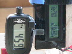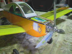 私のモータテスト機のラトルスネイクターボポーター君です。 ギヤダウンモータは、即席で固定しました。 使っているのは使い捨てカミソリの柄です。 離陸させたくて、モータを上の方に取り付けたのでぶさいくになりました。 さて、飛行は1200mA3セル(300g)と340mA3セル(270g)です。 飛行は軽快で音も静か、モータ発熱はほんのり熱くなるだけでした。 最初に300gでは、2メートルで離陸、80度ぐらいでぐいぐい上昇します。 フルハイではホバリングしながらゆっくり垂直上昇しました。 次に270gは、1メートルで離陸、軽い軽い垂直上昇でいっきに50mほど あがりました。 5フライトしまして、写真を撮ってテスト終了。 機体重量を270g以内にすれば、ファンフライ機に使用可能でしょう。 GWS1047プロペラでほとんど発熱しないので、 11インチ・12インチペラも使えるかも。 ギヤダウン化は大成功でした! さらに推力400gオーバーをめざしてモータを作ってみます。 |