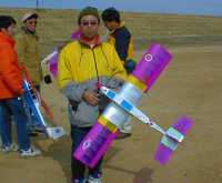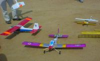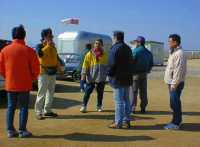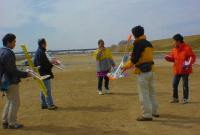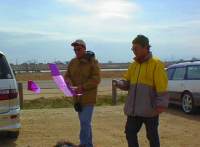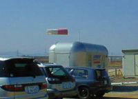 | 吹流しが真横に流れる強風でした。 | それでも風が止むのを期待して・・・ | 初参加の才川さんの F5B機?を囲んであれこれ・・・・ |