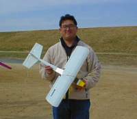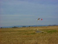 空撮用の「やぐら」が主翼上に取付けられています。 風が強かったため、し性が安定しませんでしたが、 この後見事に成功しました。 でも・・・・無理は禁物!? |